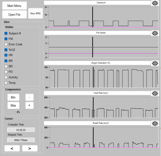 *Figure 4. MouseOx® 3.0 Simultaneous System playback view, displaying continuous cardiorespiratory data across multiple animals with selectable channels for deeper analysis.